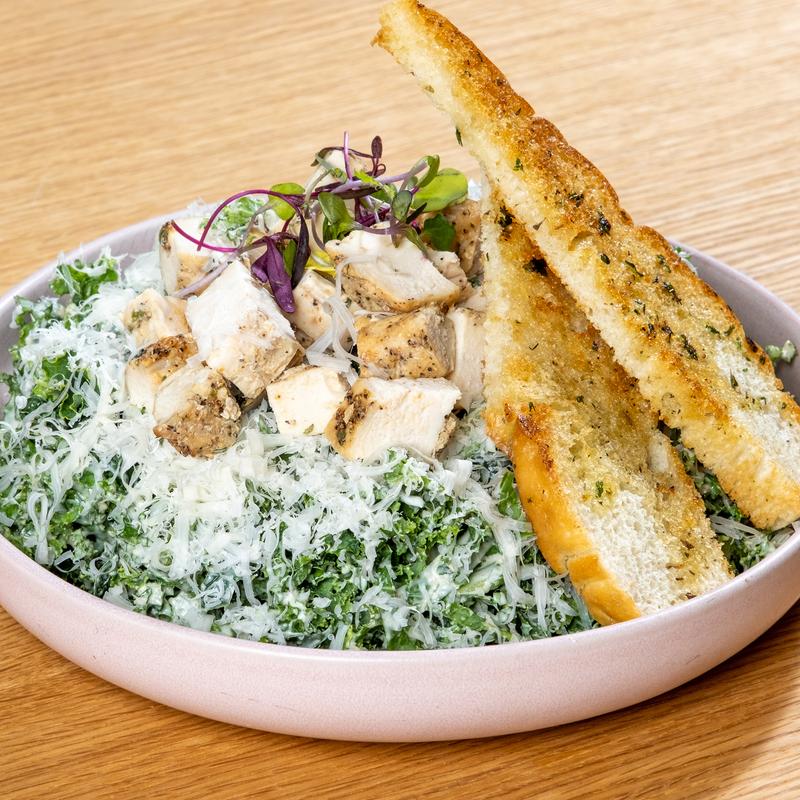 Kale / garlic-herb chicken / red radish / parmesan cheese / caesar dressing / focaccia breadsticks