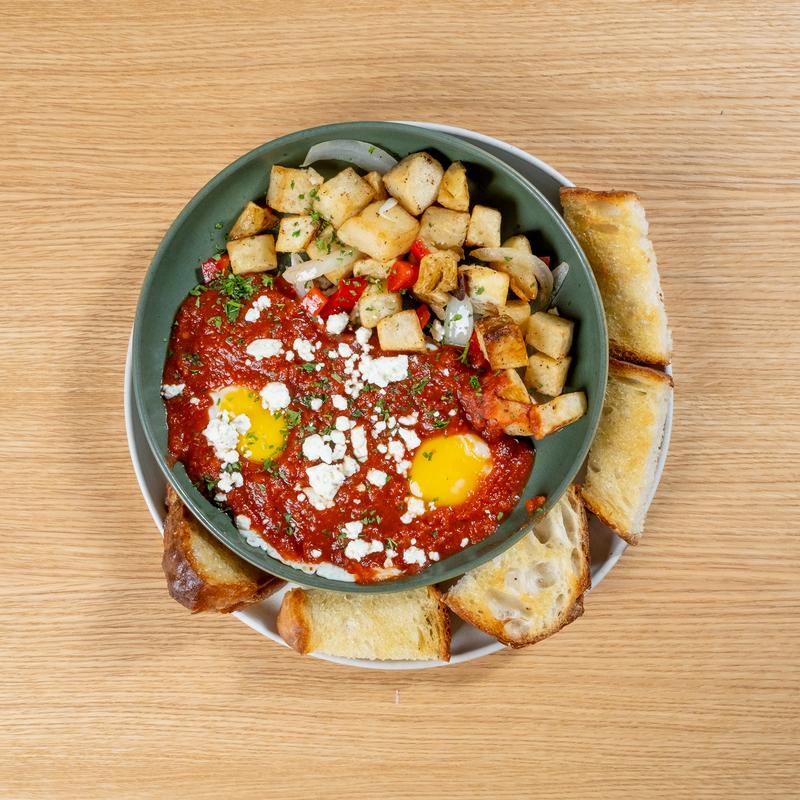 Tomato contfit sauce / fried eggs / feta / BT country potatoes / grilled sourdough