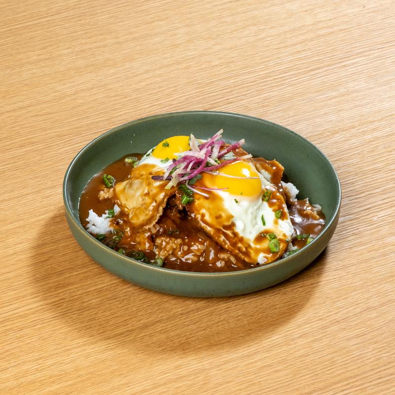 Wagyu beef patty / chard-onion beef gravy / fried eggs / white rice / green onion