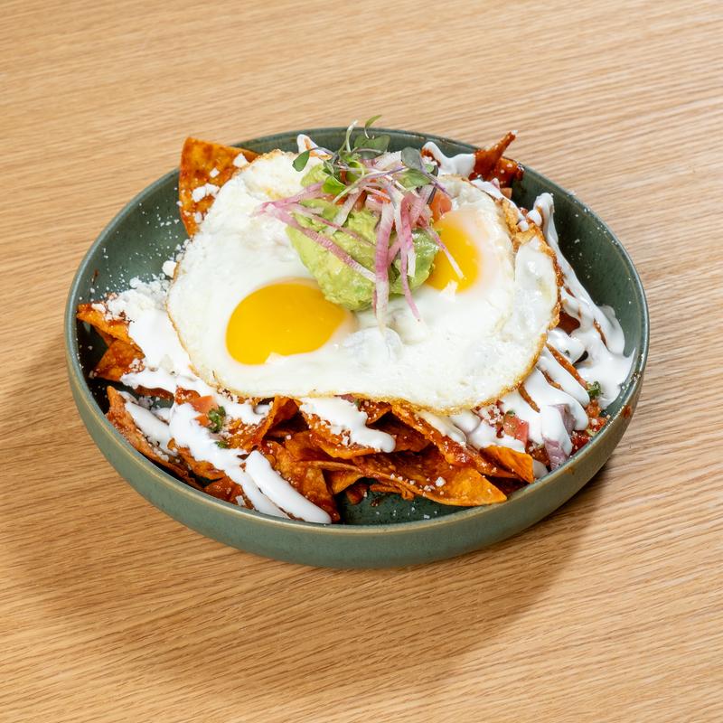 BT-fried tortilla chips / fried eggs / guacamole / salsa roja / cotija cheese / Mexican crema / pico de gallo