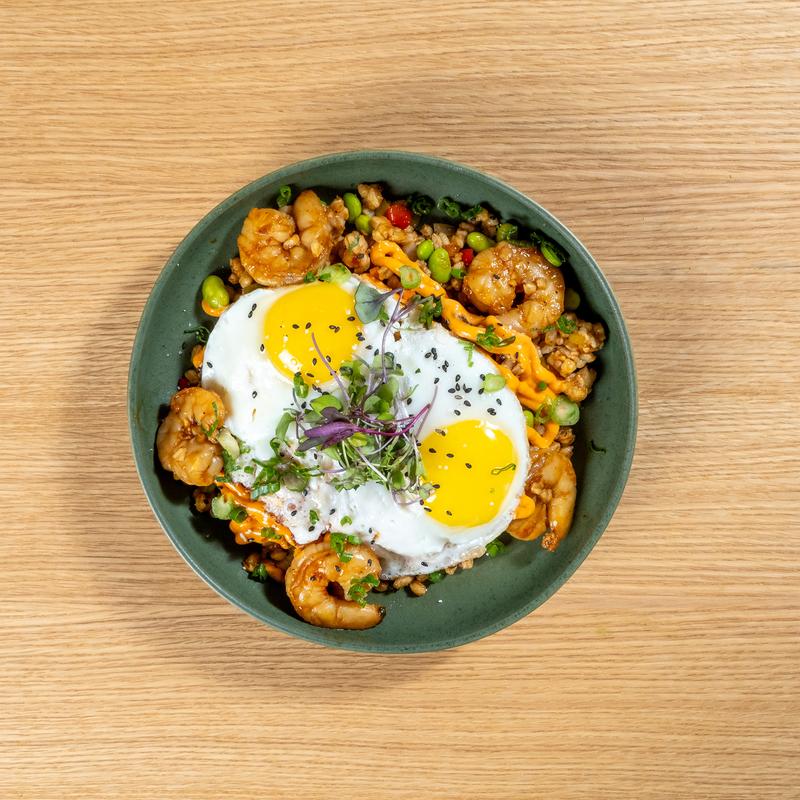 Farro fried rice / blackened shrimp / fried egg / gochujang aioli / furikake