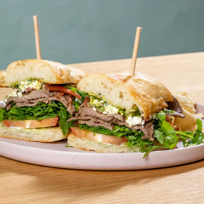 Focaccia roll / prime rib / chimichurri / tomato / arugula / balsamic marinated / onion / feta / green goddess aioli